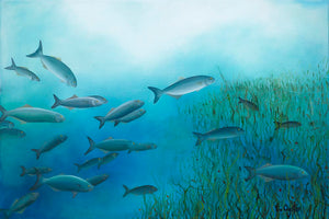 A shoal of tailor move into the weeds, hunting, waiting, preying. Dappled light through the shallows illuminates and camouflages, stealth and teamwork are key to survival. Yet, as an outsider, the prelude to the hunt is calming, despite the anticipation. The luminosity and sleek lines of these fish are the essence of beauty and wonder.
